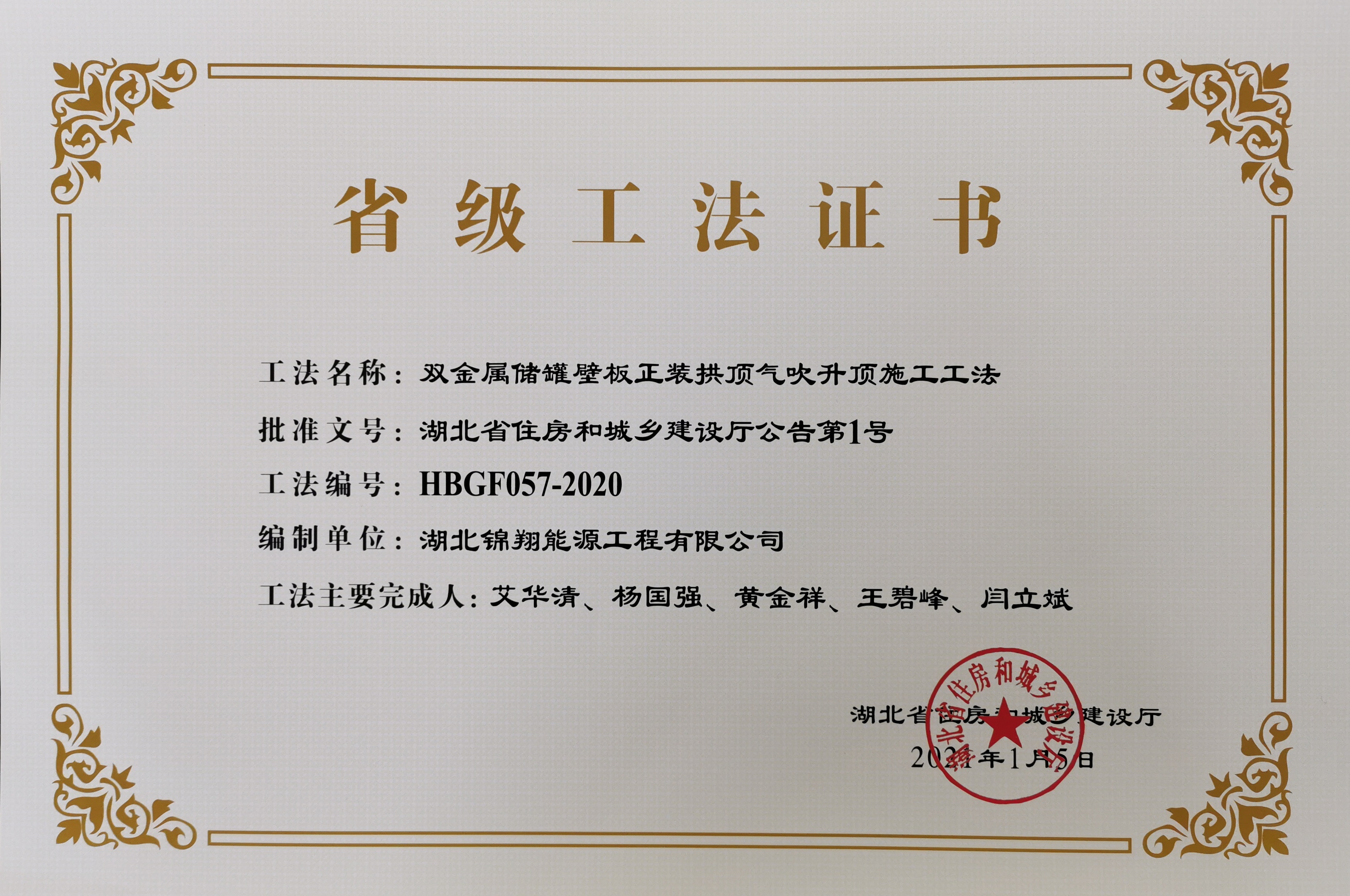 喜訊:公司《雙金屬儲(chǔ)罐壁板正裝拱頂氣吹升頂施工工法》榮獲湖北省省級(jí)工法證書